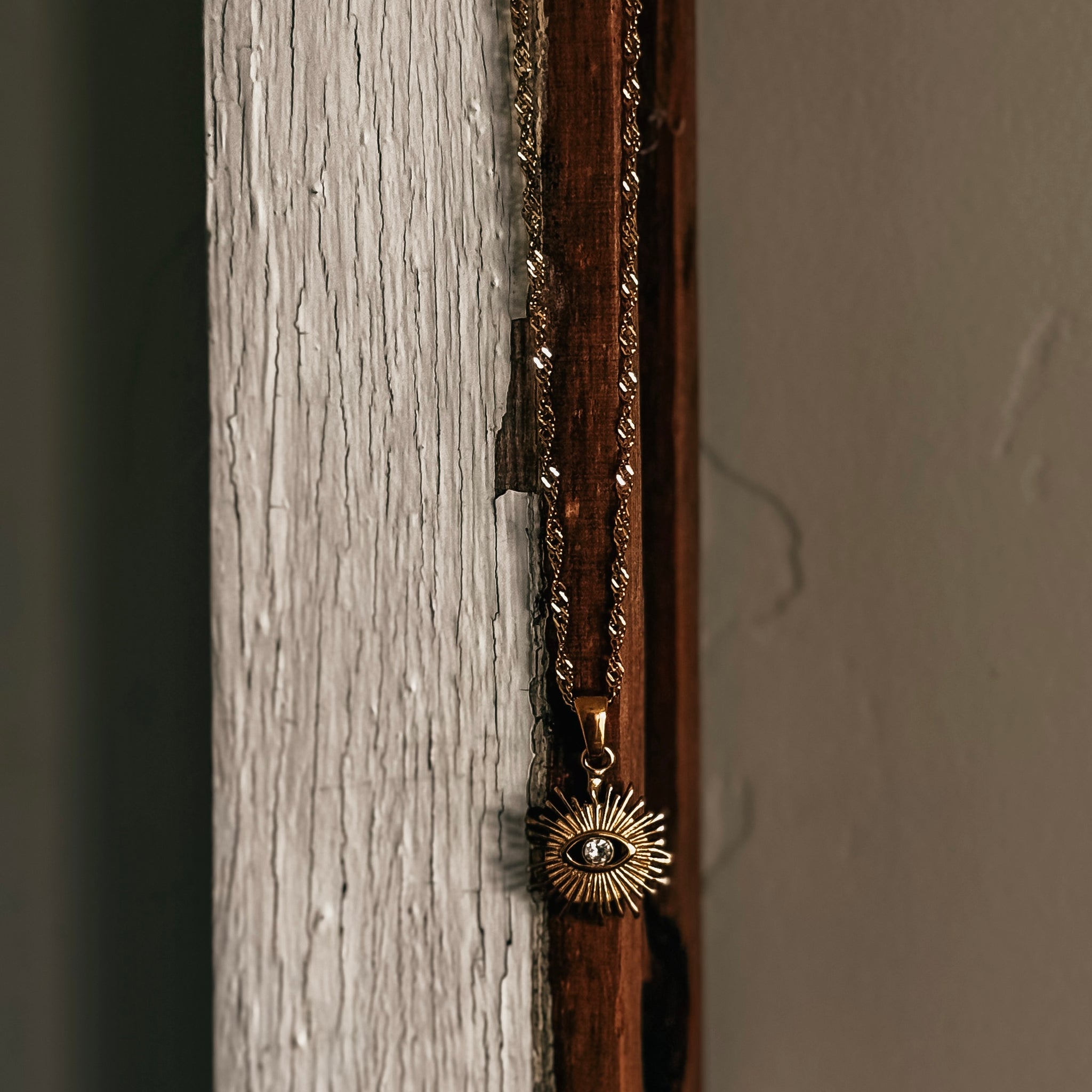 An elegant water wave 18k gold plated stainless steel adjustable chain features a sunlight zirconia eye pendant to capture your attention with this beautiful necklace.