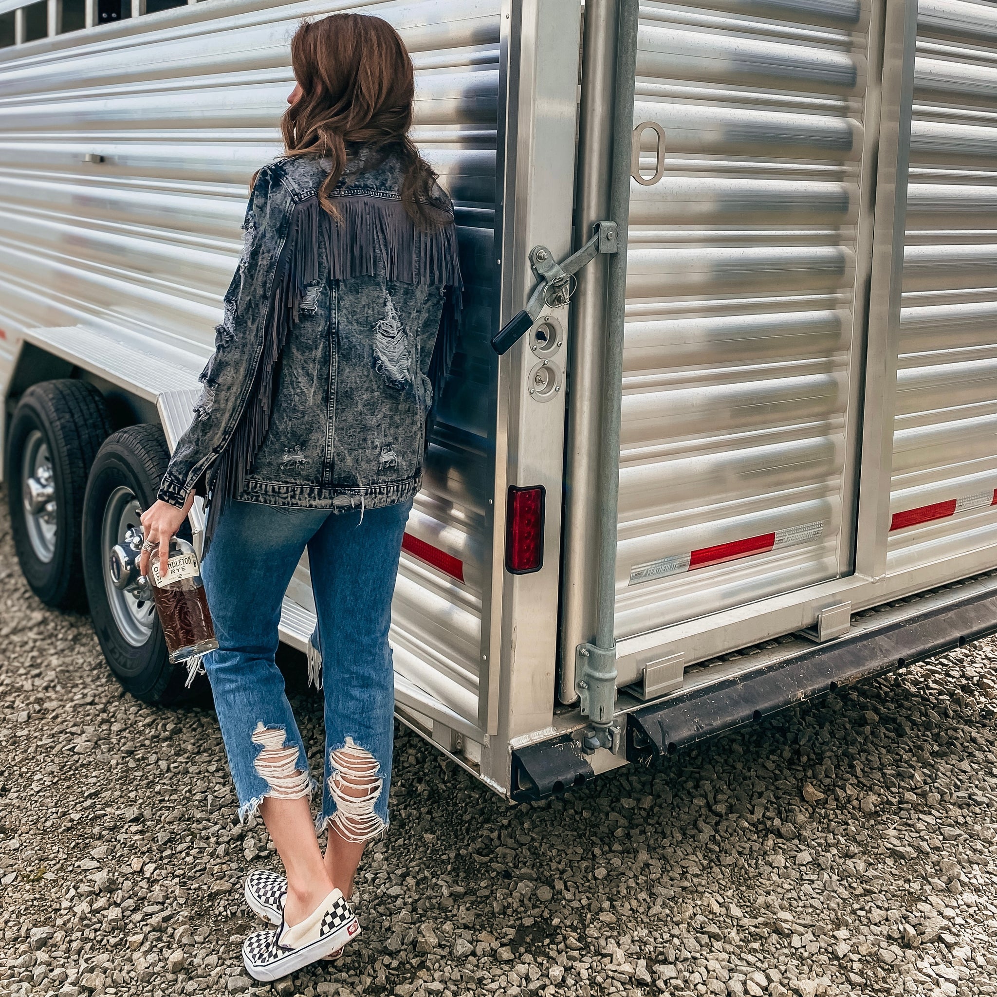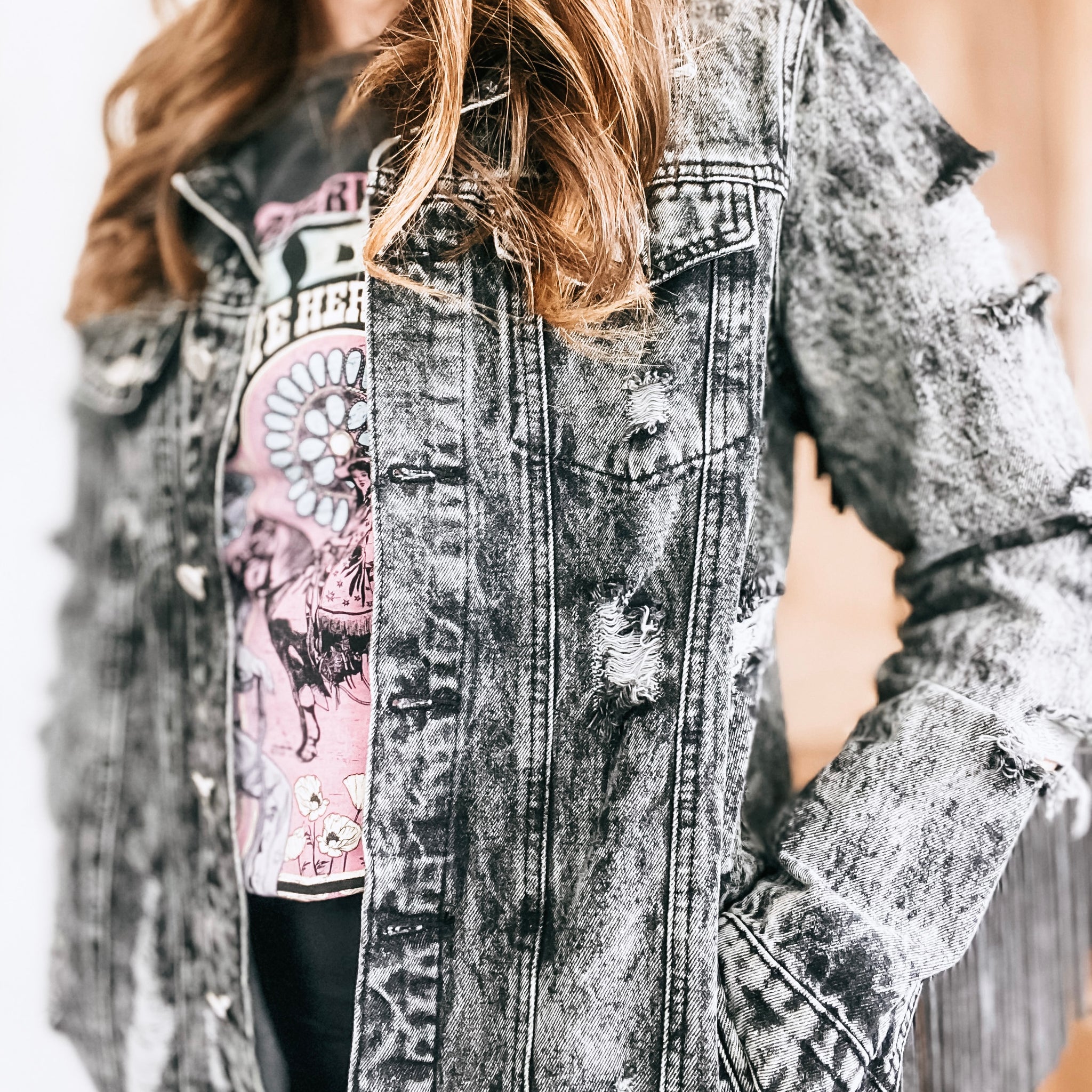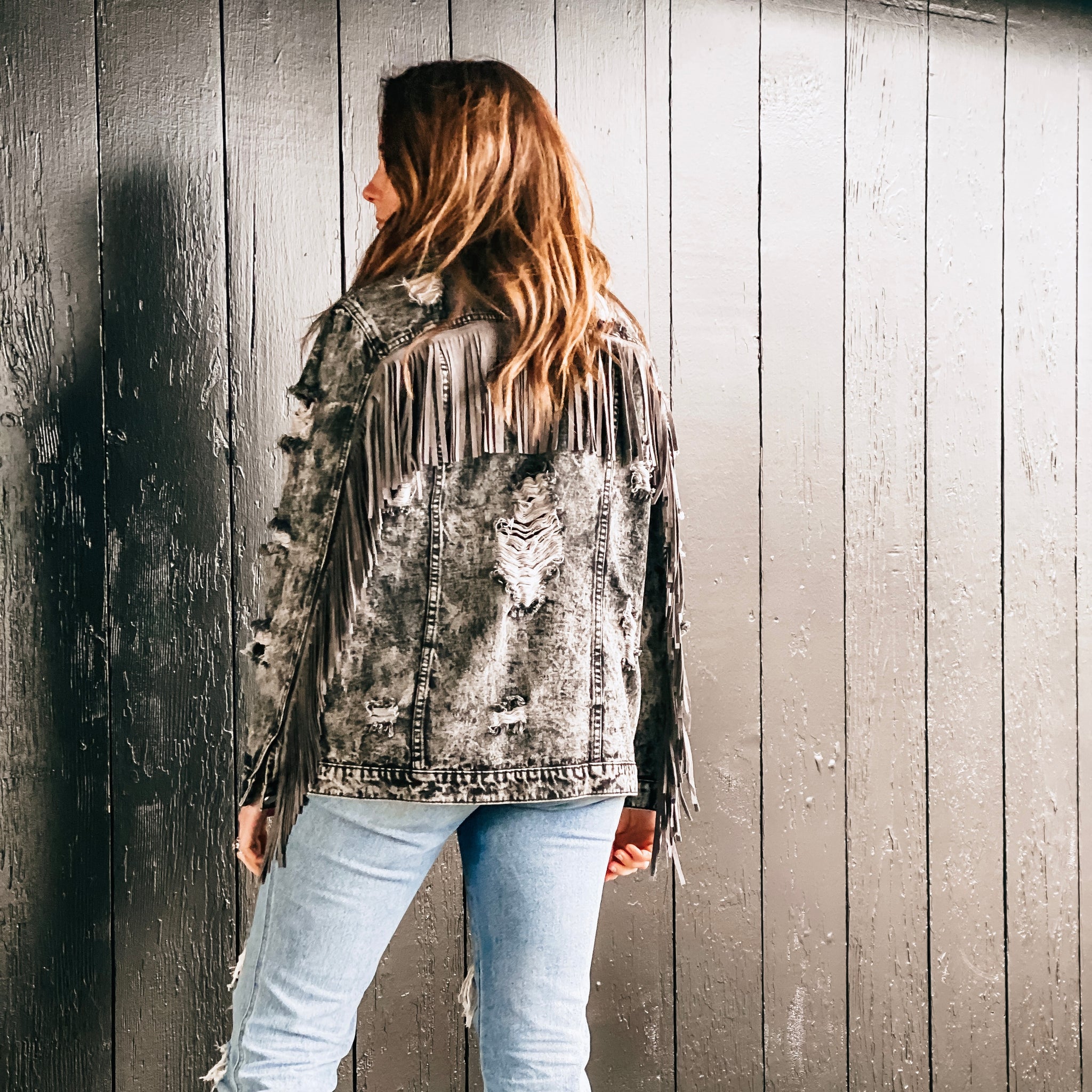 Distressed Charcoal Denim with fringe detailing on the sleeves and back. Functional buttons, side pockets, cuff long sleeves & runs true to size. Aubree wears a medium