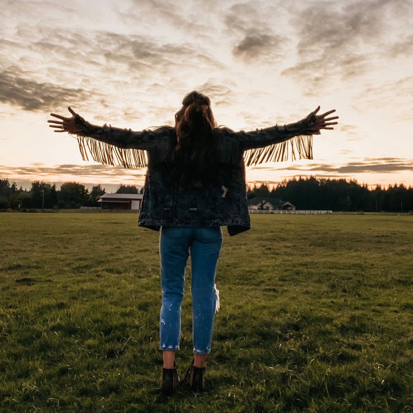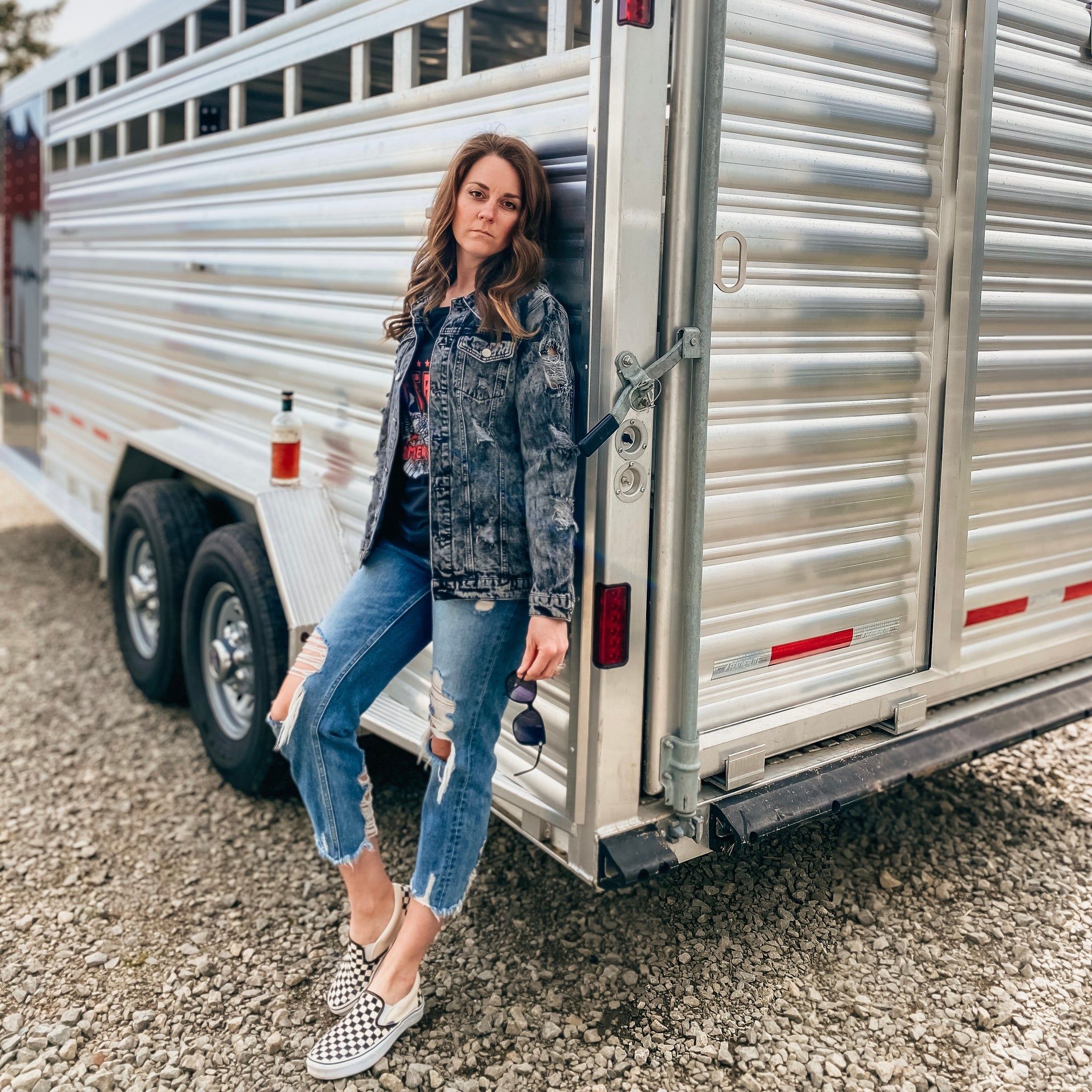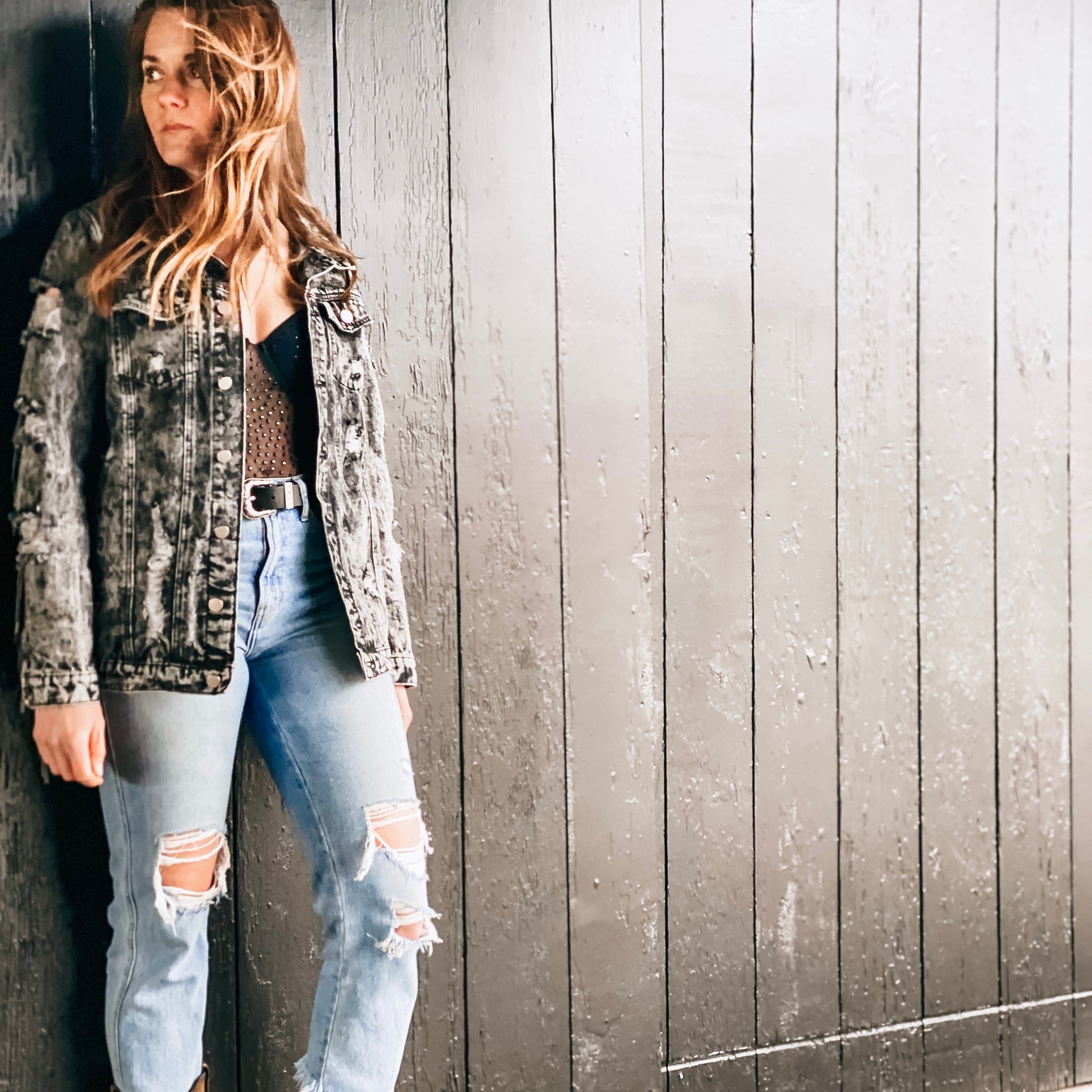 Distressed Charcoal Denim with fringe detailing on the sleeves and back. Functional buttons, side pockets, cuff long sleeves & runs true to size. Aubree wears a medium